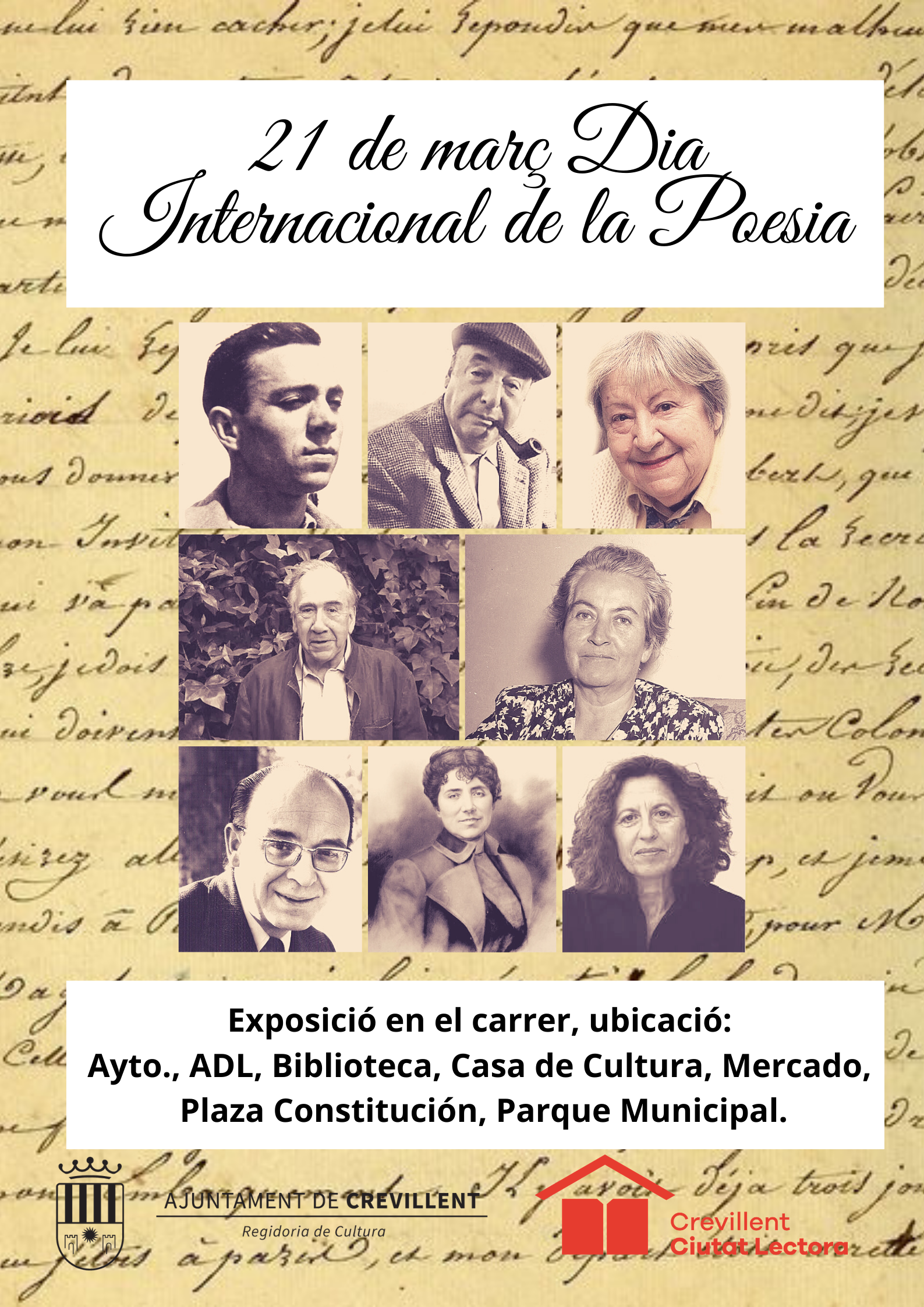 El 21 de març se celebra el Dia Internacional de la Poesia, amb l’objectiu de recolzar la diversitat lingüística la Regidoria de Cultura, exposa al carrer diversos versos de poemes ubicats en: Ajuntament, ADL, Casa Municipal de Cultura, Biblioteca, Parc Municipal, Mercat i Plaça de la Constitució.