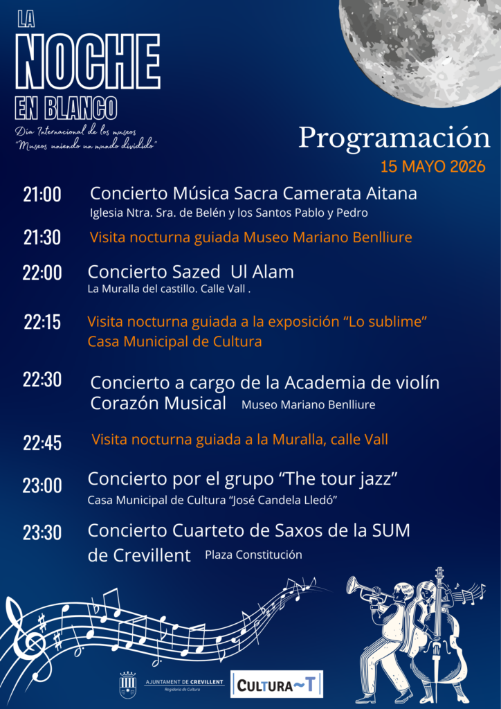 Et convidem a gaudir d’una vetlada molt especial en la qual la ciutat s’omplirà de vida, creativitat i emoció. Durant esta nit màgica, podràs recórrer diversos museus locals i descobrir exposicions d’art, història i patrimoni que posen en valor la nostra identitat cultural.