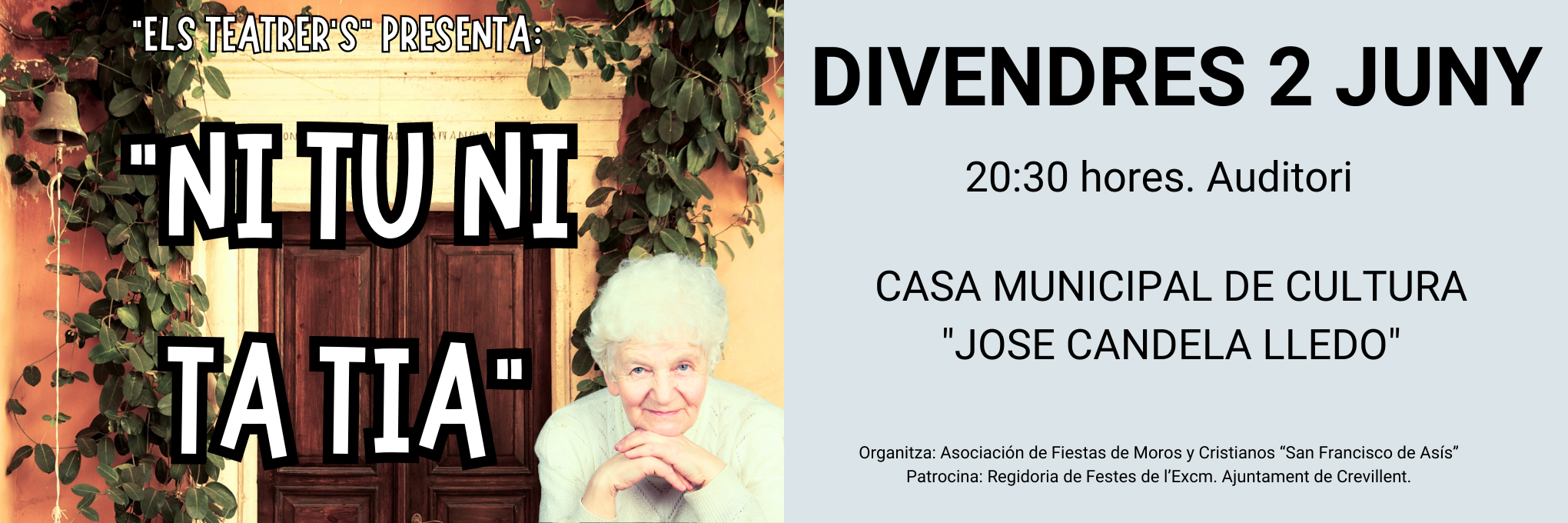 OBRA DE TEATRO “NI TÚ NI TA TÍA” UNA COMEDIA ORIGINAL DE RAFAEL CALVO Y CARDONA DIRIGIDA POR BEGO VICENTE A CARGO DE GRUPO DE TEATRO “ELS TEATRER’S”.