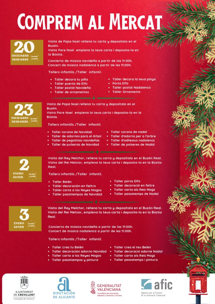 En concret, el divendres 20 de desembre el Pare Noel visitarà el Mercat d’Abastos per a rebre les cartes dels més xicotets. Eixe mateix matí, a partir de les 11.00 hores, tindrà lloc un concert de Nadal i es desenvoluparan tallers com a decoració de pinyes, creació de portes de elf, postals nadalenques i ornaments. El dimarts 23 de desembre, el Pare Noel tornarà al mercat per a continuar arreplegant cartes, acompanyat de tallers de corones de Nadal, adorns per a l’arbre, adhesius nadalencs i polseres.
