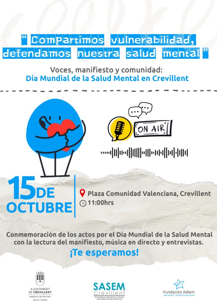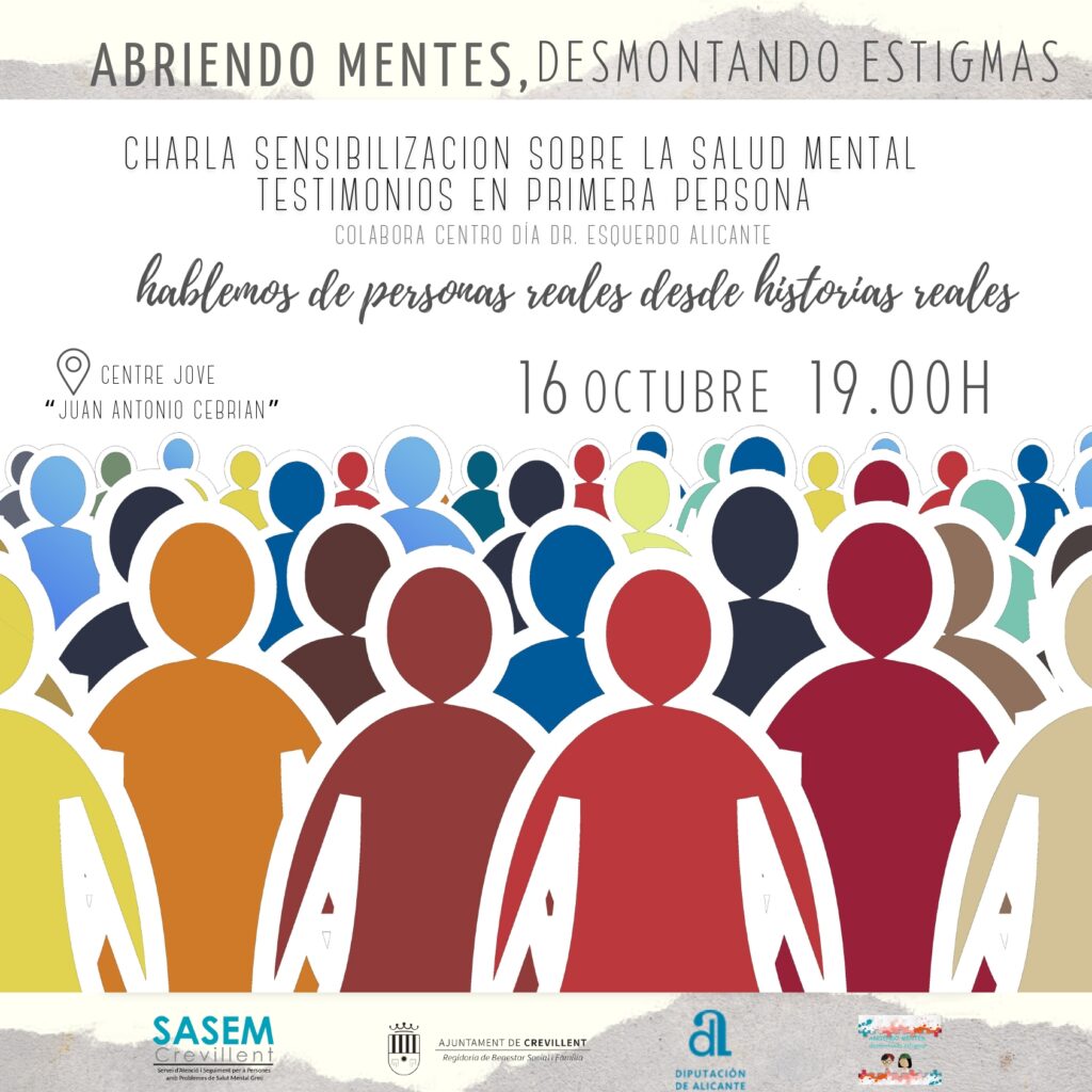 A més, el dijous 16 d’octubre es desenvoluparà la xarrada de sensibilització “Obrint ments, desmuntant estigmes” entre les 19.00 a 20.30 hores en el Centre Jove “Juan Antonio Cebrián”. Esta xarrada comptarà amb la col·laboració del Centre de Dia Dr. Esquerdo (Alacant), on dos persones expertes compartiran la seua experiència en primera persona sobre el procés de recuperació i superació d’un problema de salut mental greu. La trobada oferirà un espai de diàleg obert amb el públic, amb l’objectiu de trencar mites, reduir estigmes i fomentar l’empatia i la comprensió social cap als qui conviuen amb un diagnòstic de salut mental.