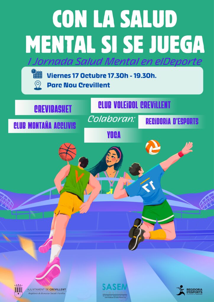 Finalment, el divendres 17 d’octubre se celebrarà la I Jornada Salut Mental i Esport. Esta activitat, en la qual col·laboren la Regidoria d’Esports, Crevi Basket, Club Muntanya Acclivis, Club Voleibol Crevillent i monitors de Zumba i Ioga, tindrà lloc en el Parc Nou, en horari de 17.30 a 19.30 hores. Sota el lema “Amb la salut mental sí que es juga”, esta jornada posarà en valor l’esport com a ferramenta d’inclusió, integració i benestar emocional. La proposta busca reforçar la importància de l’activitat física per a una vida saludable, fomentar l’autoestima, les habilitats socials i el sentit de pertinença, contribuint així a reduir l’estigmatització del col·lectiu de salut mental. La trobada comptarà amb música ambient, dinàmiques participatives i aigua per als assistents, en un ambient distés que convida a gaudir de l’esport com a punt de trobada i convivència.