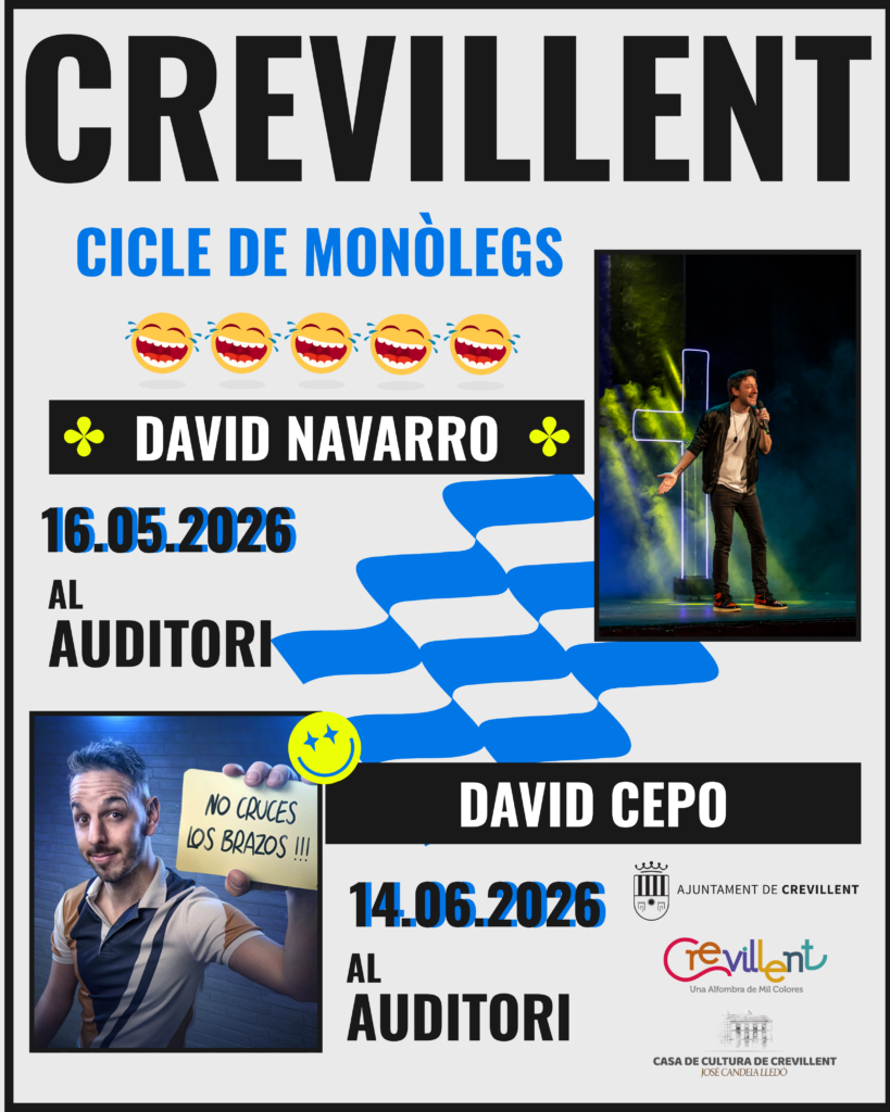 Crevillent (04/02/2026).- El Ayuntamiento de Crevillent ha presentado un ciclo de dos monólogos, apostando por el humor como una de las grandes opciones de ocio cultural para los meses de mayo y junio. Dos cómicos de primer nivel, David Navarro y David Cepo, serán los encargados de llenar de risas el escenario en dos citas muy esperadas por el público.