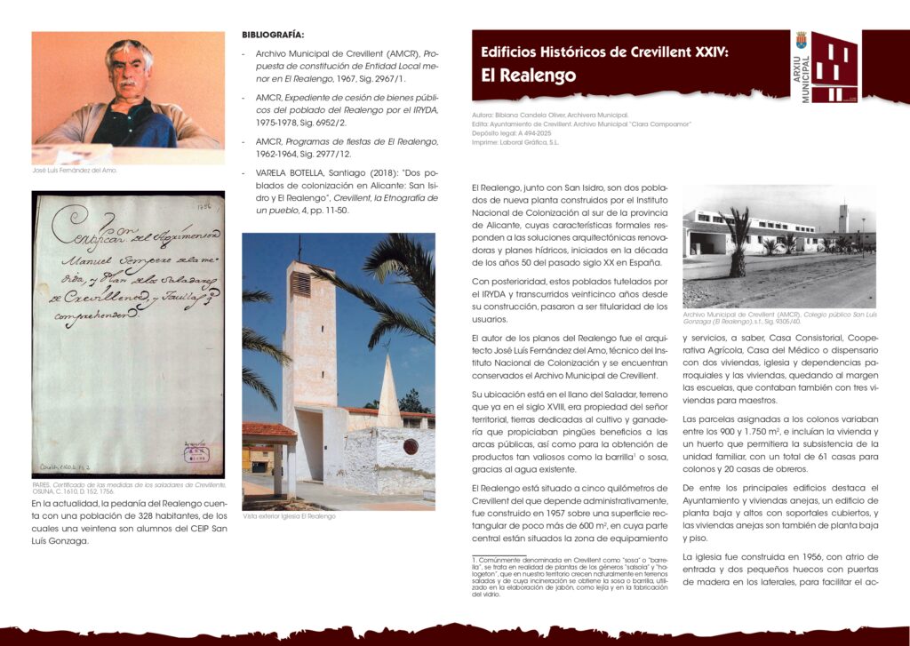 Crevillent (24/11/2025).- El Archivo Municipal Clara Campoamor retoma la publicación de la serie Edificios Históricos de Crevillent con un nuevo ejemplar, el vigésimo cuarto, en esta ocasión, dedicado a la pedanía del Realengo, cuya autora es la Archivera Municipal, Bibiana Candela Oliver.
