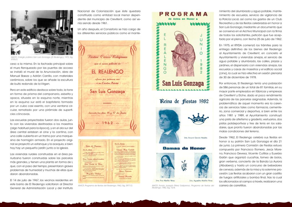 En este nuevo número se analiza el proceso de construcción de este poblado y su relación con Crevillent, ya que el 14 de julio de 1967, fueron los propios vecinos quienes solicitaron al Director General de Administración Local y del Instituto Nacional de Colonización, que el Realengo quedara constituido como entidad local menor dependiente del municipio de Crevillent, como así venía siendo desde 1961, por entonces con cerca de 600 residentes.