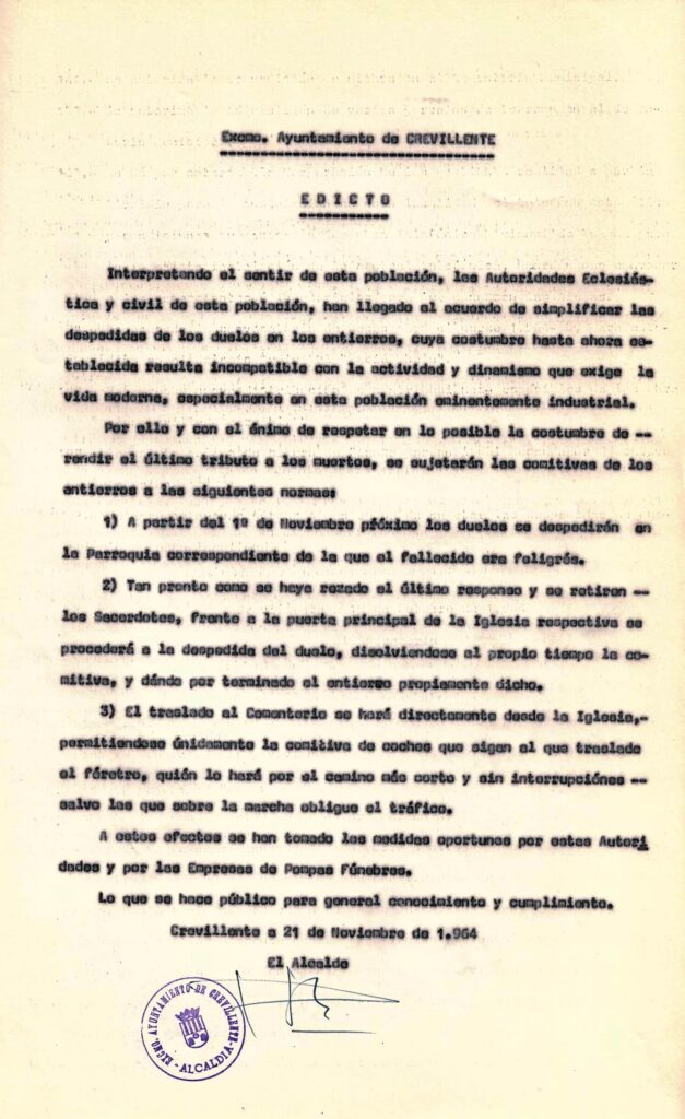 Crevillent (30/10/2025).- Con motivo del Día de Todos los Santos, el Archivo Municipal “Clara Campoamor” da a conocer la normativa para la despedida de los duelos, aprobada por el Ayuntamiento en 1964.