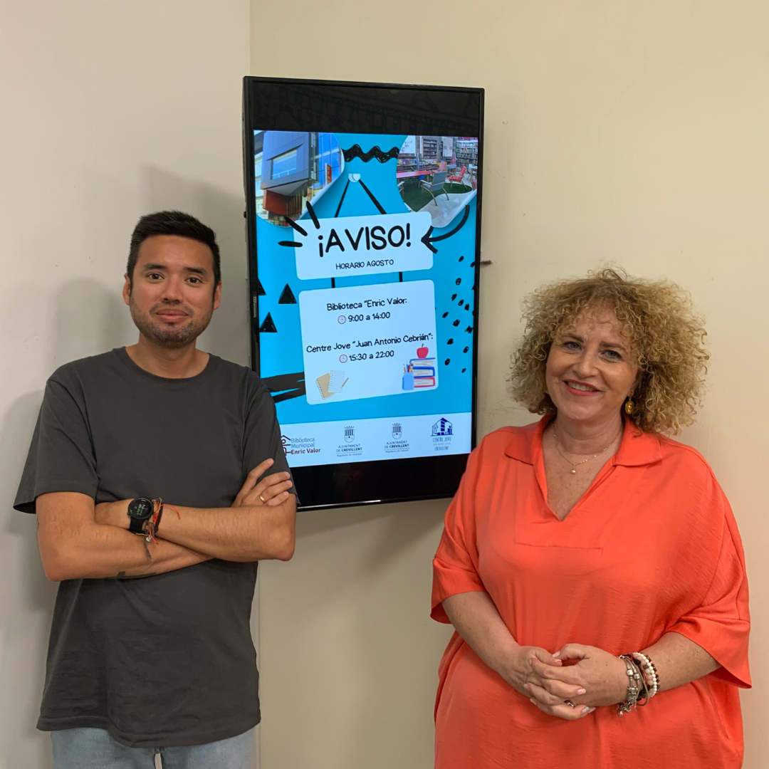 Crevillent (26/07/2024).- El regidor de Joventut, Pedro García Magro, i la regidora de Cultura, Mónica San Emeterio, han presentat durant el matí de hui el nou horari que tindrà tant el Centre Jove “Juan Antonio Cebrián” com la Biblioteca Municipal “Enric Valor” durant el mes d’agost. “Aquest govern és un govern que escolta i, per això, a petició dels veïns i veïnes més joves de les localitat, farem possible que seguisca en funcionament tant la Biblioteca com el Centre Jove a l’agost, perquè així puguen gaudir de les instal·lacions i estudiar en elles” ha manifestat l’edil de Joventut, García Magro.
