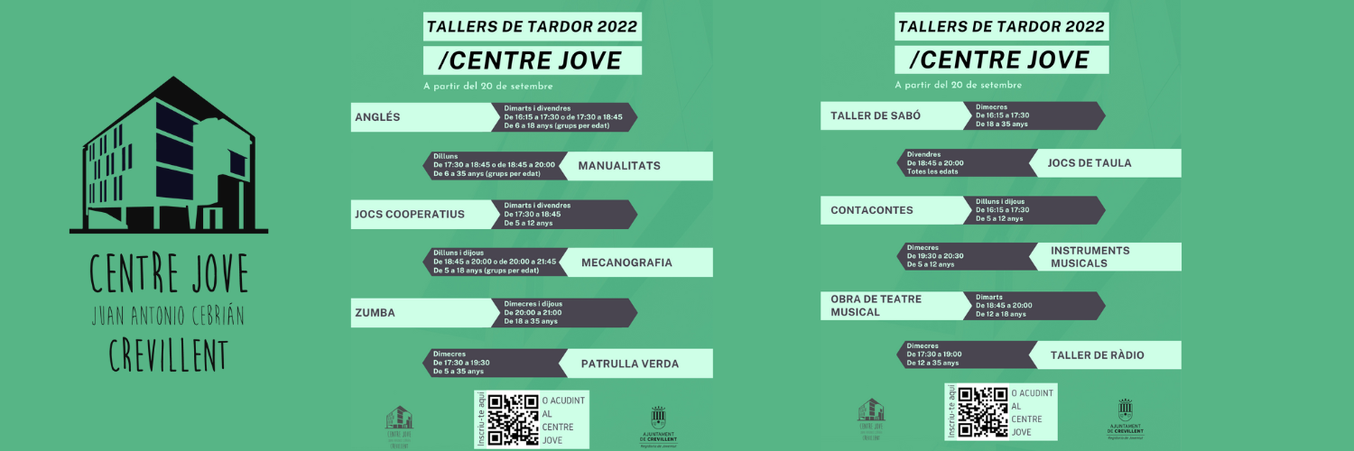 Crevillent (20/09/2022).- El Centre Jove comença el curs amb una nova oferta de 12 tallers: Manualitats, anglés, jocs cooperatius, mecanografia, zumba, patrulla verda, taller de sabó, jocs de taula, contacontes, taller d’instruments musicals, obra de teatre musical i taller de ràdio.