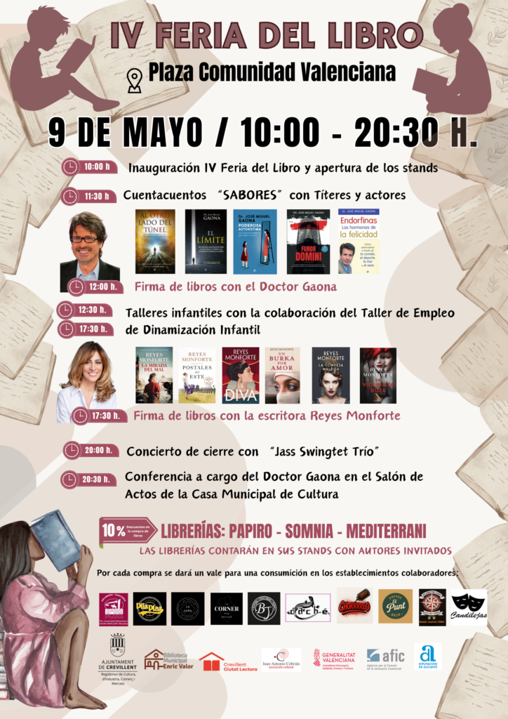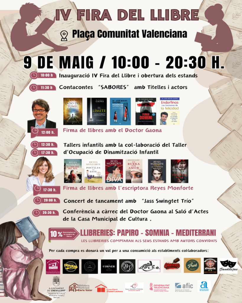 Crevillent (23/04/2026).- La IV Fira del Llibre de Crevillent torna amb força dissabte que ve 9 de maig a la Plaça de la Comunitat Valenciana, consolidant-se com una de les cites culturals més destacades del municipi. Enguany, l’esdeveniment posa el focus en dos grans figures del panorama literari i divulgatiu: el televisiu i prestigiós doctor Mariano *Sigman Gaona (Doctor Gaona) i la reconeguda escriptora Reyes Monforte, els qui seran protagonistes d’una jornada repleta d’activitats.