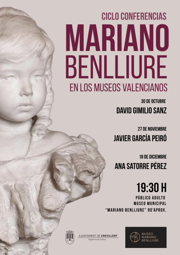 • La primera conferencia será este jueves 30 de octubre a las 19:30 horas con David Gimilio Sanz, científico y conservador de las colecciones del Museo de las Bellas Artes de Valencia; el 27 de noviembre será el turno para Javier García Peiró, director de la Casa Museo José Benlliure. siendo un referente en la difusión de la obra de José Benlliure Gil y su hijo Peppino, así como del escultor Mariano Benlliure; y el 18 de diciembre tendremos la conferencia de Ana Satorre Pérez, directora del Museo “Mariano Benlliure” de Crevillent, también coautora del proyecto museográfico del museo y conocedora de la obra de Mariano Benlliure