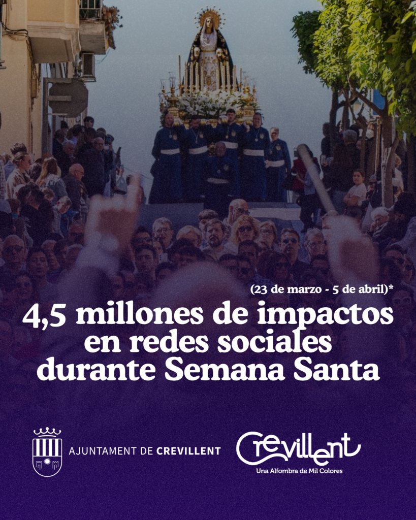 Des de l’Ajuntament se subratlla la magnitud de la cobertura aconseguida, fruit d’un pla estratègic de difusió que ha contribuït a reforçar la projecció de la Setmana Santa de Crevillent i a consolidar el creixement dels perfils institucionals en xarxes socials.