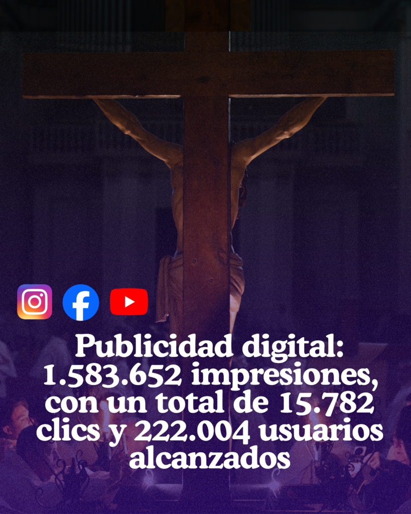 Pel que fa a la campanya de publicitat digital (ADS) en Instagram, Facebook i YouTube, centrada en la promoció del cartell oficial i de l’espot de la Setmana Santa s’han registrat 1.583.652 impressions, amb un total de 15.782 clics i un abast de 222.004 usuaris.