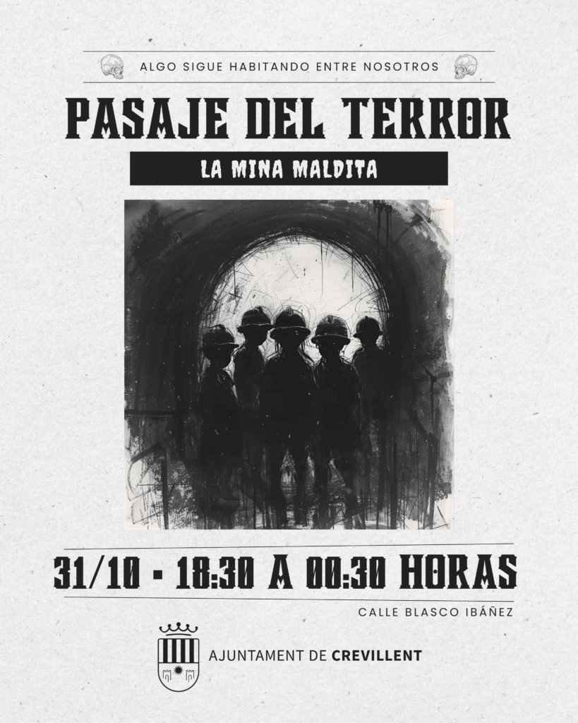 • A partir de les 18:30 hores i fins a les 00:30 hores, tindrem el passatge del terror «La mina maldita», des de carrer Blasco Ibáñez, endinsant-se els participants en un circuit d’animació i ambientació terrorífics