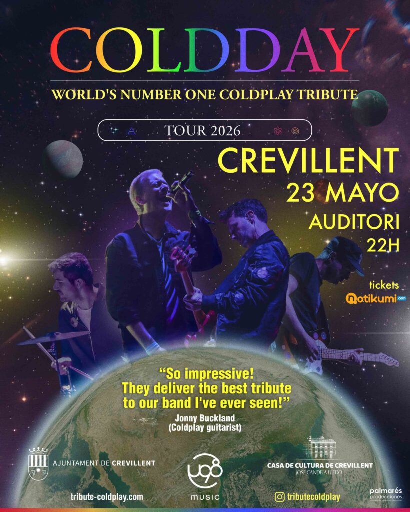 El dissabte 23 de maig, a les 22.00 hores, serà el torn de la música internacional amb COLDDAY, banda tribut a Coldplay reconeguda en nombrosos països per la seua fidelitat sonora i visual a la banda britànica. Amb el seu “Tour 2026”, el grup oferirà un espectacle que recrea l’atmosfera i l’energia dels directes de Coldplay, combinant una cuidada interpretació musical amb una potent escenografia i projeccions envolupants. Este tribut ha recorregut països com França, Portugal, el Regne Unit, Bèlgica, Alemanya, Àustria, Bèlgica, Romania, Luxemburg, Malàisia o Indonèsia, replicant les diferents gires de la banda britànica. Les entrades tenen un preu de 12 euros, més gastos de gestió, i ja es poden aconseguir a través de www.notikumi.com.