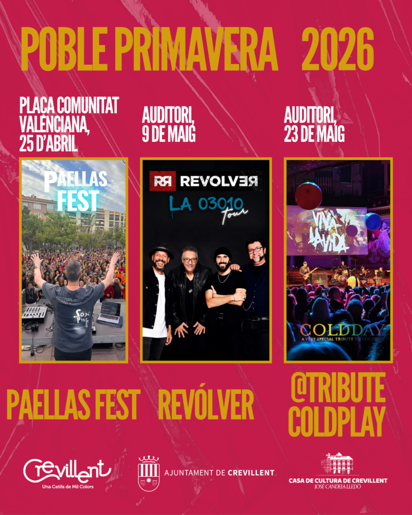 Crevillent (05/02/2026).- El Ayuntamiento de Crevillent presenta el ciclo “Poble Primavera”, una propuesta que combina diferentes espectáculos musicales durante los meses de abril y mayo, con las actuaciones del grupo emblema del rock español Revólver, Coldday – Tributo de Coldplay y el Paellas Fest, según ha comunicado el concejal de Fiestas, Antonio Candel Rives.